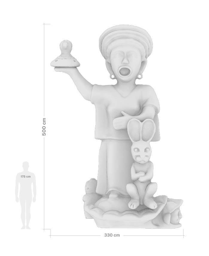After studying the collection, Minerva Cuevas created a large sculpture by combining and modifying five pre-Hispanic pieces. The sculpture offers a scene of relationships. The woman holds a bird in one hand (“Coquín” was the family’s name for Carmen Tejero and means bird in colloquial Mayan). At the same time, she holds and roots herself on the shell of a turtle; for that cosmovision, the earthly world floats in the middle of the original waters: the Earth is represented as a turtle emerging from them.