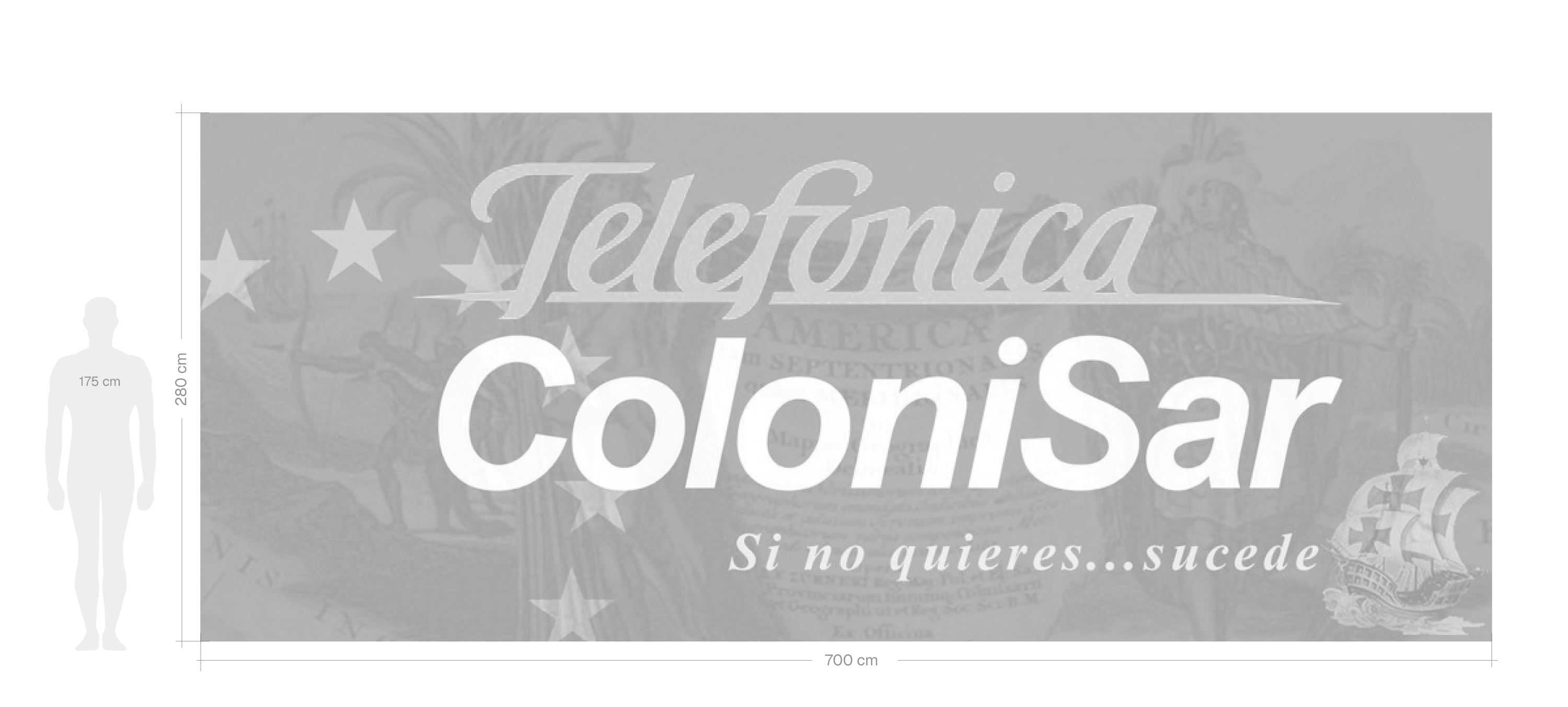 This mural alters the visual elements of a cell phone company’s advertising with the phrase “Telefonica ColoniSar. If you don’t want it...it happens.” In the background, there is an illustration of the Chronicles of the Indies, emphasizing the historical continuity of colonization processes and the current privatization of communications.